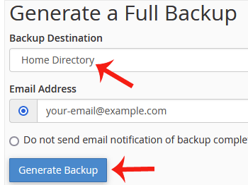 Choose Home Directory as the backup destination from the drop-down menu, and enter your email address to receive a notification once the process is complete.