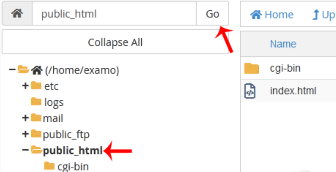 3. Navigate to the directory where you want to upload your files. For example, to upload files to your website, go to /public_html by double-clicking the public_html folder in the directory list.